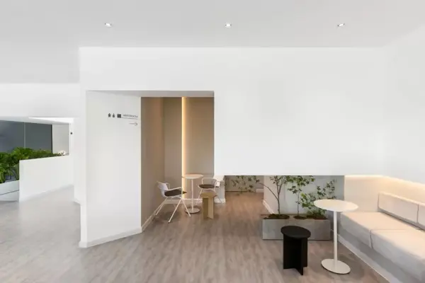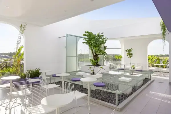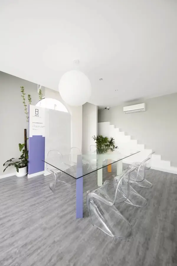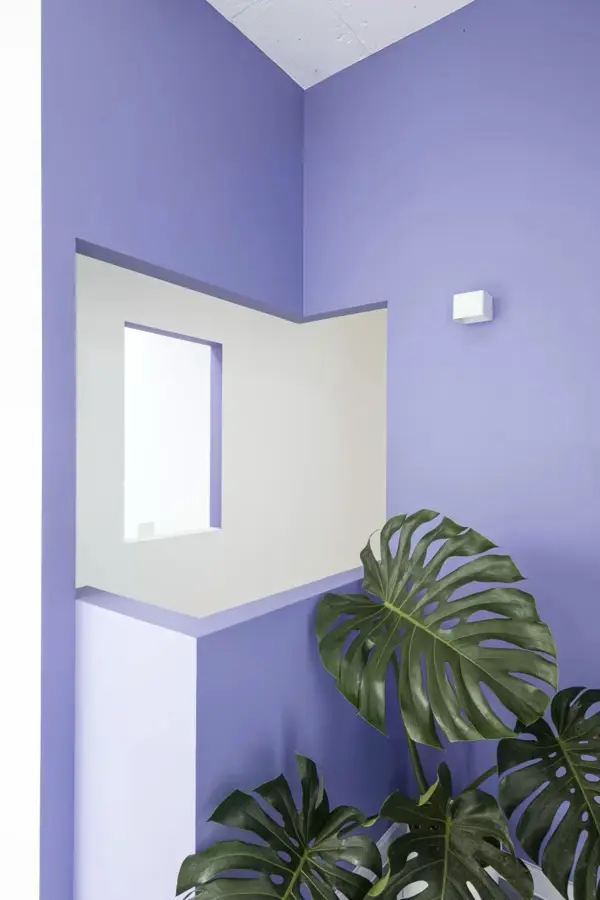 Ý tưởng thiết kế hình thành từ tinh thần “thoát vỏ” – ẩn dụ cho sự chuyển dịch khỏi mô hình nhà ở đóng kín, hướng đến không gian mở, có tính cộng đồng và tương tác cao. Thay vì bố cục truyền thống, kiến trúc được thao tác bằng việc trừ khối để mở khoảng – cộng khối để tạo điểm nhấn, hình thành nên các lớp không gian chồng lớp giàu tính chuyển tiếp. Việc khoét sâu các bề mặt, mở ô lấy sáng và tạo khoảng đệm kết hợp cây xanh giúp kiểm soát ánh sáng, giảm nắng trực tiếp, đồng thời kiến tạo trải nghiệm thị giác sinh động cho từng góc nhìn. Bảng màu chủ đạo – trắng, xám và tím – được phát triển dựa trên bộ nhận diện thương hiệu, đóng vai trò như công cụ thể hiện tinh thần trẻ trung, khác biệt và sẵn sàng thích nghi với những biến chuyển thị giác trong tương lai.