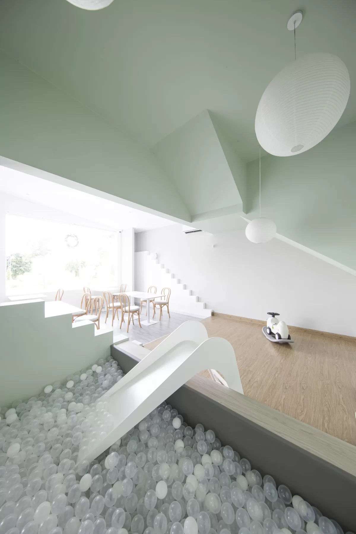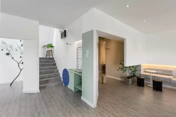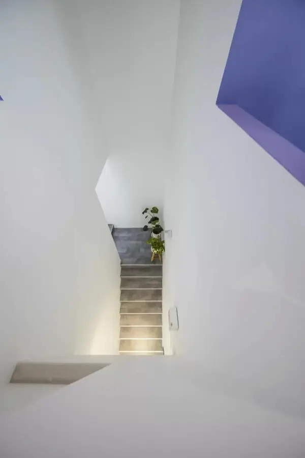 Ý tưởng thiết kế hình thành từ tinh thần “thoát vỏ” – ẩn dụ cho sự chuyển dịch khỏi mô hình nhà ở đóng kín, hướng đến không gian mở, có tính cộng đồng và tương tác cao. Thay vì bố cục truyền thống, kiến trúc được thao tác bằng việc trừ khối để mở khoảng – cộng khối để tạo điểm nhấn, hình thành nên các lớp không gian chồng lớp giàu tính chuyển tiếp. Việc khoét sâu các bề mặt, mở ô lấy sáng và tạo khoảng đệm kết hợp cây xanh giúp kiểm soát ánh sáng, giảm nắng trực tiếp, đồng thời kiến tạo trải nghiệm thị giác sinh động cho từng góc nhìn. Bảng màu chủ đạo – trắng, xám và tím – được phát triển dựa trên bộ nhận diện thương hiệu, đóng vai trò như công cụ thể hiện tinh thần trẻ trung, khác biệt và sẵn sàng thích nghi với những biến chuyển thị giác trong tương lai.